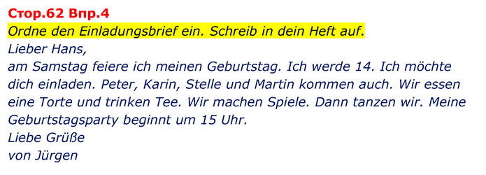 Ordne den Einladungsbrief ein. Schreib in dein Heft auf. Lieber Hans, am Samstag feiere ich meinen Geburtstag. Ich werde 14. Ich möchte dich einladen. Peter, Karin, Stelle und Martin kommen auch. Wir essen eine Torte und trinken Tee. Wir machen Spiele. Dann tanzen wir. Meine Geburtstagsparty beginnt um 15 Uhr. Liebe Grüße von Jürgen