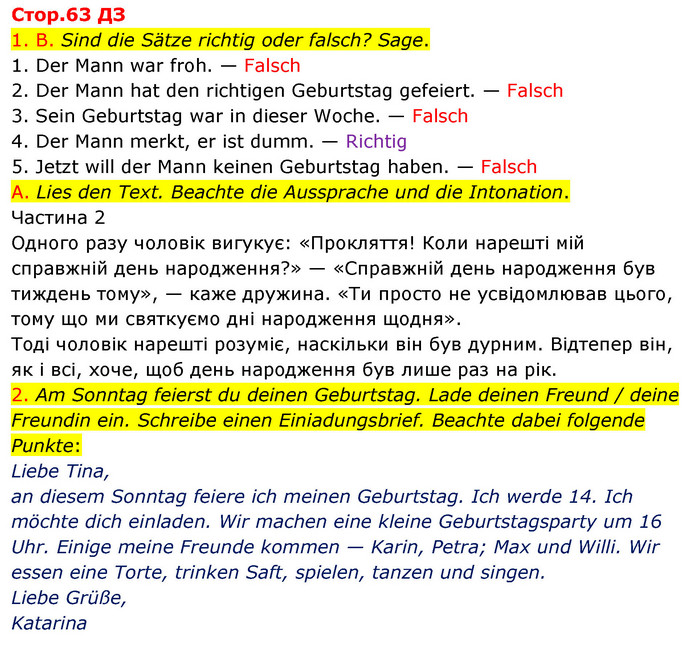 1. B. Sind die Sätze richtig oder falsch? Sage. 1. Der Mann war froh. — Falsch 2. Der Mann hat den richtigen Geburtstag gefeiert. — Falsch 3. Sein Geburtstag war in dieser Woche. — Falsch 4. Der Mann merkt, er ist dumm. — Richtig 5. Jetzt will der Mann keinen Geburtstag haben. — Falsch A. Lies den Text. Beachte die Aussprache und die Intonation. Частина 2 Одного разу чоловік вигукує: «Прокляття! Коли нарешті мій справжній день народження?» — «Справжній день народження був тиждень тому», — каже дружина. «Ти просто не усвідомлював цього, тому що ми святкуємо дні народження щодня». Тоді чоловік нарешті розуміє, наскільки він був дурним. Відтепер він, як і всі, хоче, щоб день народження був лише раз на рік. 2. Am Sonntag feierst du deinen Geburtstag. Lade deinen Freund / deine Freundin ein. Schreibe einen Einiadungsbrief. Beachte dabei folgende Punkte: Liebe Tina, an diesem Sonntag feiere ich meinen Geburtstag. Ich werde 14. Ich möchte dich einladen. Wir machen eine kleine Geburtstagsparty um 16 Uhr. Einige meine Freunde kommen — Karin, Petra; Max und Willi. Wir essen eine Torte, trinken Saft, spielen, tanzen und singen. Liebe Grüße, Katarina
