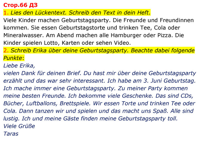 1. Lies den Lückentext. Schreib den Text in dein Heft. Viele Kinder machen Geburtstagsparty. Die Freunde und Freundinnen kommen. Sie essen Geburtstagstorte und trinken Tee, Cola oder Mineralwasser. Am Abend machen alle Hamburger oder Pizza. Die Kinder spielen Lotto, Karten oder sehen Video. 2. Schreib Erika über deine Geburtstagsparty. Beachte dabei folgende Punkte: Liebe Erika, vielen Dank für deinen Brief. Du hast mir über deine Geburtstagsparty erzählt und das war sehr interessant. Ich habe am 3. Juni Geburtstag. Ich mache immer eine Geburtstagsparty. Zu meiner Party kommen meine besten Freunde. Ich bekomme viele Geschenke. Das sind CDs, Bücher, Luftballons, Brettspiele. Wir essen Torte und trinken Tee oder Cola. Dann tanzen wir und spielen und das macht uns Spaß. Alle sind lustig. Ich und meine Gäste finden meine Geburtstagsparty toll. Viele Grüße Taras