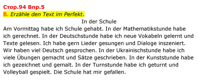 B. Erzähle den Text im Perfekt. In der Schule Am Vormittag habe ich Schule gehabt. In der Mathematikstunde habe ich gerechnet. In der Deutschstunde habe ich neue Vokabeln gelernt und Texte gelesen. Ich habe gern Lieder gesungen und Dialoge inszeniert. Wir haben viel Deutsch gesprochen. In der Ukrainischstunde habe ich viele Übungen gemacht und Sätze geschrieben. In der Kunststunde habe ich gezeichnet und gemalt. In der Turnstunde habe ich geturnt und Volleyball gespielt. Die Schule hat mir gefallen.