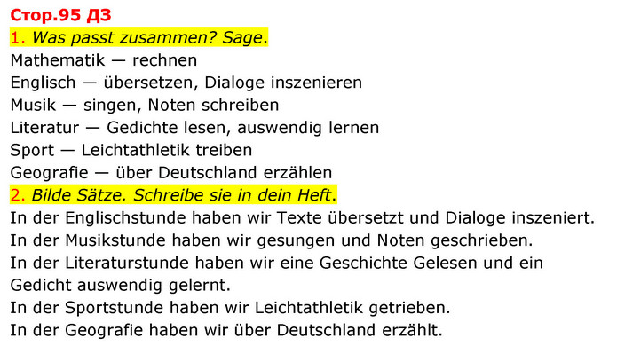 1. Was passt zusammen? Sage. Mathematik — rechnen Englisch — übersetzen, Dialoge inszenieren Musik — singen, Noten schreiben Literatur — Gedichte lesen, auswendig lernen Sport — Leichtathletik treiben Geografie — über Deutschland erzählen 2. Bilde Sätze. Schreibe sie in dein Heft. In der Englischstunde haben wir Texte übersetzt und Dialoge inszeniert. In der Musikstunde haben wir gesungen und Noten geschrieben. In der Literaturstunde haben wir eine Geschichte Gelesen und ein Gedicht auswendig gelernt. In der Sportstunde haben wir Leichtathletik getrieben. In der Geografie haben wir über Deutschland erzählt.