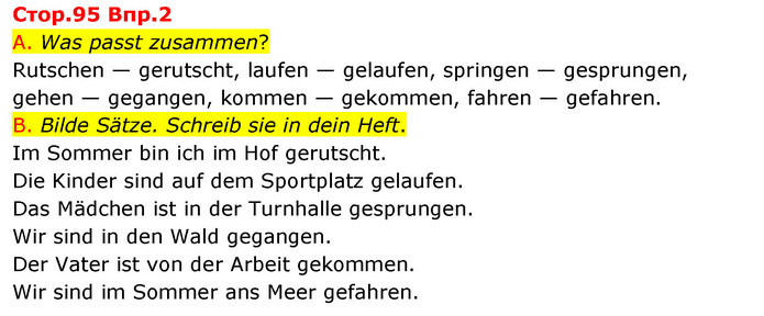 A. Was passt zusammen? Rutschen — gerutscht, laufen — gelaufen, springen — gesprungen, gehen — gegangen, kommen — gekommen, fahren — gefahren. B. Bilde Sätze. Schreib sie in dein Heft. Im Sommer bin ich im Hof gerutscht. Die Kinder sind auf dem Sportplatz gelaufen. Das Mädchen ist in der Turnhalle gesprungen. Wir sind in den Wald gegangen. Der Vater ist von der Arbeit gekommen. Wir sind im Sommer ans Meer gefahren.
