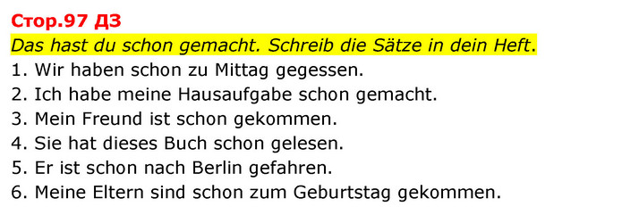 Das hast du schon gemacht. Schreib die Sätze in dein Heft. 1. Wir haben schon zu Mittag gegessen. 2. Ich habe meine Hausaufgabe schon gemacht. 3. Mein Freund ist schon gekommen. 4. Sie hat dieses Buch schon gelesen. 5. Er ist schon nach Berlin gefahren. 6. Meine Eltern sind schon zum Geburtstag gekommen.