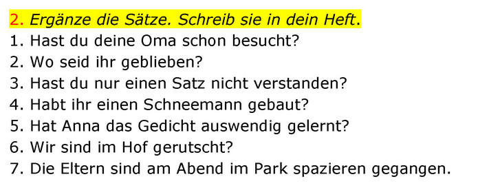 2. Ergänze die Sätze. Schreib sie in dein Heft. 1. Hast du deine Oma schon besucht? 2. Wo seid ihr geblieben? 3. Hast du nur einen Satz nicht verstanden? 4. Habt ihr einen Schneemann gebaut? 5. Hat Anna das Gedicht auswendig gelernt? 6. Wir sind im Hof gerutscht? 7. Die Eltern sind am Abend im Park spazieren gegangen.
