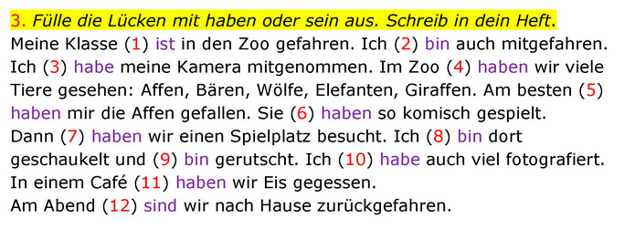 3. Fülle die Lücken mit haben oder sein aus. Schreib in dein Heft. Meine Klasse (1) ist in den Zoo gefahren. Ich (2) bin auch mitgefahren. Ich (3) habe meine Kamera mitgenommen. Im Zoo (4) haben wir viele Tiere gesehen: Affen, Bären, Wölfe, Elefanten, Giraffen. Am besten (5) haben mir die Affen gefallen. Sie (6) haben so komisch gespielt. Dann (7) haben wir einen Spielplatz besucht. Ich (8) bin dort geschaukelt und (9) bin gerutscht. Ich (10) habe auch viel fotografiert. In einem Café (11) haben wir Eis gegessen. Am Abend (12) sind wir nach Hause zurückgefahren.