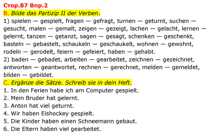 B. Biide das Partizip II der Verben. 1) spielen — gespielt, fragen — gefragt, turnen — geturnt, suchen — gesucht, malen — gemalt, zeigen — gezeigt, lachen — gelacht, lernen — gelernt, tanzen — getanzt, sagen — gesagt, schenken — geschenkt, basteln — gebastelt, schaukeln — geschaukelt, wohnen — gewohnt, rodeln — gerodelt, feiern — gefeiert, haben — gehabt. 2) baden — gebadet, arbeiten — gearbeitet, zeichnen — gezeichnet, antworten — geantwortet, rechnen — gerechnet, melden — gemeldet, bilden — gebildet. C. Ergänze die Sätze. Schreib sie in dein Heft. 1. In den Ferien habe ich am Computer gespielt. 2. Mein Bruder hat gelernt. 3. Anton hat viel geturnt. 4. Wir haben Eishockey gespielt. 5. Die Kinder haben einen Schneemann gebaut. 6. Die Eltern haben viel gearbeitet.