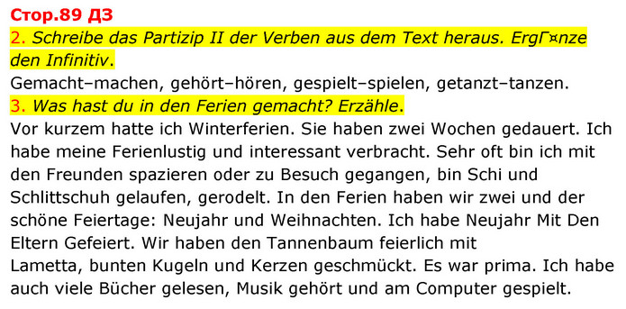 2. Schreibe das Partizip II der Verben aus dem Text heraus. ErgГ¤nze den Infinitiv. Gemacht–machen, gehört–hören, gespielt–spielen, getanzt–tanzen. 3. Was hast du in den Ferien gemacht? Erzähle. Vor kurzem hatte ich Winterferien. Sie haben zwei Wochen gedauert. Ich habe meine Ferienlustig und interessant verbracht. Sehr oft bin ich mit den Freunden spazieren oder zu Besuch gegangen, bin Schi und Schlittschuh gelaufen, gerodelt. In den Ferien haben wir zwei und der schöne Feiertage: Neujahr und Weihnachten. Ich habe Neujahr Mit Den Eltern Gefeiert. Wir haben den Tannenbaum feierlich mit Lametta, bunten Kugeln und Kerzen geschmückt. Es war prima. Ich habe auch viele Bücher gelesen, Musik gehört und am Computer gespielt.