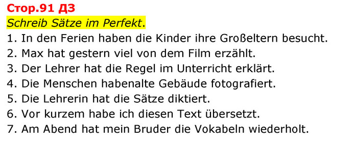 Schreib Sätze im Perfekt. 1. In den Ferien haben die Kinder ihre Großeltern besucht. 2. Max hat gestern viel von dem Film erzählt. 3. Der Lehrer hat die Regel im Unterricht erklärt. 4. Die Menschen habenalte Gebäude fotografiert. 5. Die Lehrerin hat die Sätze diktiert. 6. Vor kurzem habe ich diesen Text übersetzt. 7. Am Abend hat mein Bruder die Vokabeln wiederholt.