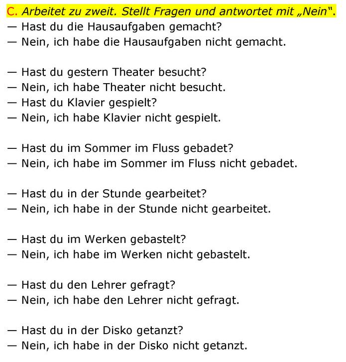 C. Arbeitet zu zweit. Stellt Fragen und antwortet mit „Nein“. — Hast du die Hausaufgaben gemacht? — Nein, ich habe die Hausaufgaben nicht gemacht. — Hast du gestern Theater besucht? — Nein, ich habe Theater nicht besucht. — Hast du Klavier gespielt? — Nein, ich habe Klavier nicht gespielt. — Hast du im Sommer im Fluss gebadet? — Nein, ich habe im Sommer im Fluss nicht gebadet. — Hast du in der Stunde gearbeitet? — Nein, ich habe in der Stunde nicht gearbeitet. — Hast du im Werken gebastelt? — Nein, ich habe im Werken nicht gebastelt. — Hast du den Lehrer gefragt? — Nein, ich habe den Lehrer nicht gefragt. — Hast du in der Disko getanzt? — Nein, ich habe in der Disko nicht getanzt.