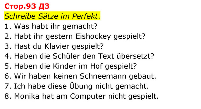 Schreibe Sätze im Perfekt. 1. Was habt ihr gemacht? 2. Habt ihr gestern Eishockey gespielt? 3. Hast du Klavier gespielt? 4. Haben die Schüler den Text übersetzt? 5. Haben die Kinder im Hof gespielt? 6. Wir haben keinen Schneemann gebaut. 7. Ich habe diese Übung nicht gemacht. 8. Monika hat am Computer nicht gespielt.