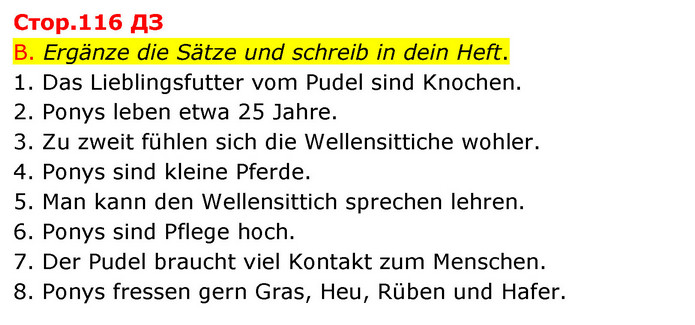 B. Ergänze die Sätze und schreib in dein Heft. 1. Das Lieblingsfutter vom Pudel sind Knochen. 2. Ponys leben etwa 25 Jahre. 3. Zu zweit fühlen sich die Wellensittiche wohler. 4. Ponys sind kleine Pferde. 5. Man kann den Wellensittich sprechen lehren. 6. Ponys sind Pflege hoch. 7. Der Pudel braucht viel Kontakt zum Menschen. 8. Ponys fressen gern Gras, Heu, Rüben und Hafer.
