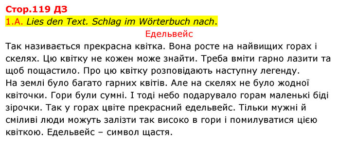 1.A. Lies den Text. Schlag im Wörterbuch nach. Едельвейс Так називається прекрасна квітка. Вона росте на найвищих горах і скелях. Цю квітку не кожен може знайти. Треба вміти гарно лазити та щоб пощастило. Про цю квітку розповідають наступну легенду. На землі було багато гарних квітів. Але на скелях не було жодної квіточки. Гори були сумні. І тоді небо подарувало горам маленькі біді зірочки. Так у горах цвіте прекрасний едельвейс. Тільки мужні й сміливі люди можуть залізти так високо в гори і помилуватися цією квіткою. Едельвейс – символ щастя.