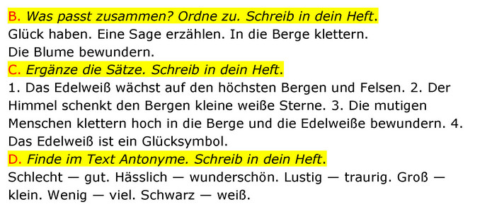 B. Was passt zusammen? Ordne zu. Schreib in dein Heft. Glück haben. Eine Sage erzählen. In die Berge klettern. Die Blume bewundern. C. Ergänze die Sätze. Schreib in dein Heft. 1. Das Edelweiß wächst auf den höchsten Bergen und Felsen. 2. Der Himmel schenkt den Bergen kleine weiße Sterne. 3. Die mutigen Menschen klettern hoch in die Berge und die Edelweiße bewundern. 4. Das Edelweiß ist ein Glücksymbol. D. Finde im Text Antonyme. Schreib in dein Heft. Schlecht — gut. Hässlich — wunderschön. Lustig — traurig. Groß — klein. Wenig — viel. Schwarz — weiß.