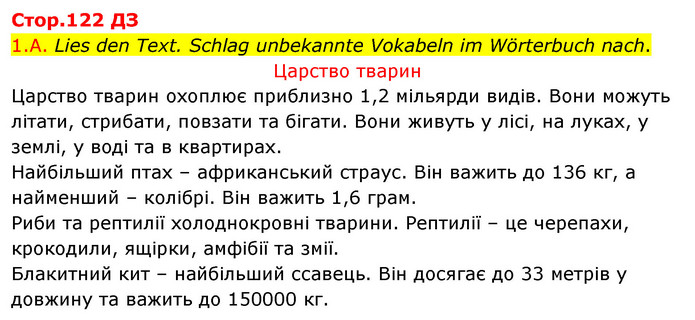 1.A. Lies den Text. Schlag unbekannte Vokabeln im Wörterbuch nach. Царство тварин Царство тварин охоплює приблизно 1,2 мільярди видів. Вони можуть літати, стрибати, повзати та бігати. Вони живуть у лісі, на луках, у землі, у воді та в квартирах. Найбільший птах – африканський страус. Він важить до 136 кг, а найменший – колібрі. Він важить 1,6 грам. Риби та рептилії холоднокровні тварини. Рептилії – це черепахи, крокодили, ящірки, амфібії та змії. Блакитний кит – найбільший ссавець. Він досягає до 33 метрів у довжину та важить до 150000 кг.