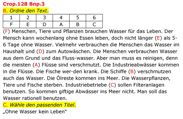 В. Ordne den Text. (F) Menschen, Tiere und Pflanzen brauchen Wasser für das Leben. Der Mensch kann wochenlang ohne Essen leben, doch nicht länger (Е) als 5-6 Tage ohne Wasser. Vielmehr verbrauchen die Menschen das Wasser im Haushalt und (D) zum Autowäschen. Die Menschen verbrauchen Wasser aus dem Grund und das Flusswasser. Aber man muss es reinigen, denn die meisten (A) Flüsse sind verschmutzt. Die Industrieabwässer kommen in die Flüsse. Die Fische werden krank. Die Schiffe (B) verschmutzen auch das Wasser. Die Ölreste kommen ins Meer. Die Wasserpflanzen, Tiere und Fische sterben. Industriebetriebe (C) sollen Filteranlagen benutzen. So kommen giftige Abwässer ins Meer nicht. Man soll das Wasser rationell benutzen. С. Wähle den passenden Titel. „Ohne Wasser kein Leben“