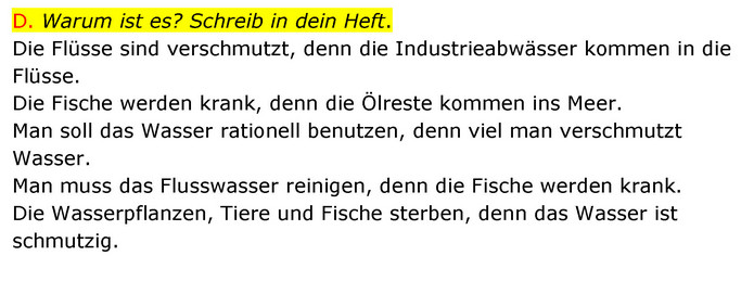 D. Warum ist es? Schreib in dein Heft. Die Flüsse sind verschmutzt, denn die Industrieabwässer kommen in die Flüsse. Die Fische werden krank, denn die Ölreste kommen ins Meer. Man soll das Wasser rationell benutzen, denn viel man verschmutzt Wasser. Man muss das Flusswasser reinigen, denn die Fische werden krank. Die Wasserpflanzen, Tiere und Fische sterben, denn das Wasser ist schmutzig.