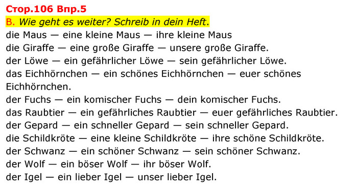 B. Wie geht es weiter? Schreib in dein Heft. die Maus — eine kleine Maus — ihre kleine Maus die Giraffe — eine große Giraffe — unsere große Giraffe. der Löwe — ein gefährlicher Löwe — sein gefährlicher Löwe. das Eichhörnchen — ein schönes Eichhörnchen — euer schönes Eichhörnchen. der Fuchs — ein komischer Fuchs — dein komischer Fuchs. das Raubtier — ein gefährliches Raubtier — euer gefährliches Raubtier. der Gepard — ein schneller Gepard — sein schneller Gepard. die Schildkröte — eine kleine Schildkröte — ihre schöne Schildkröte. der Schwanz — ein schöner Schwanz — sein schöner Schwanz. der Wolf — ein böser Wolf — ihr böser Wolf. der Igel — ein lieber Igel — unser lieber Igel.