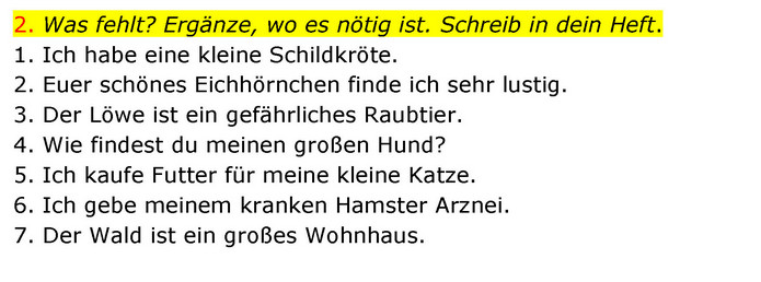 2. Was fehlt? Ergänze, wo es nötig ist. Schreib in dein Heft. 1. Ich habe eine kleine Schildkröte. 2. Euer schönes Eichhörnchen finde ich sehr lustig. 3. Der Löwe ist ein gefährliches Raubtier. 4. Wie findest du meinen großen Hund? 5. Ich kaufe Futter für meine kleine Katze. 6. Ich gebe meinem kranken Hamster Arznei. 7. Der Wald ist ein großes Wohnhaus.