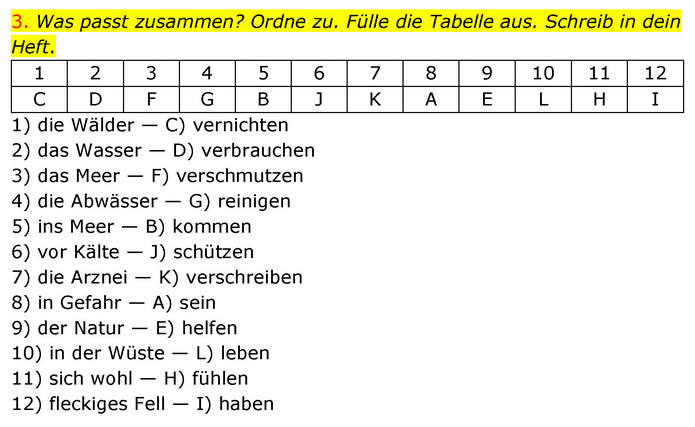 Was passt zusammen? Ordne zu. Fülle die Tabelle aus. Schreib in dein Heft. 1 2 3 4 5 6 7 8 9 10 11 12 С D F G B J K A E L H I 1) die Wälder — C) vernichten 2) das Wasser — D) verbrauchen 3) das Meer — F) verschmutzen 4) die Abwässer — G) reinigen 5) ins Meer — B) kommen 6) vor Kälte — J) schützen 7) die Arznei — K) verschreiben 8) in Gefahr — A) sein 9) der Natur — E) helfen 10) in der Wüste — L) leben 11) sich wohl — H) fühlen 12) fleckiges Fell — I) haben