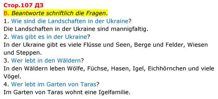 B. Beantworte schriftlich die Fragen. 1. Wie sind die Landschaften in der Ukraine? Die Landschaften in der Ukraine sind mannigfaltig. 2. Was gibt es in der Ukraine? In der Ukraine gibt es viele Flüsse und Seen, Berge und Felder, Wiesen und Steppen. 3. Wer lebt in den Wäldern? In den Wäldern leben Wölfe, Füchse, Hasen, Igel, Eichhörnchen und viele Vögel. 4. Wer lebt im Garten von Taras? Im Garten von Taras wohnt eine Igelfamilie.