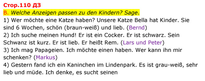B. Welche Anzeigen passen zu den Kindern? Sage. 1) Wer möchte eine Katze haben? Unsere Katze Bella hat Kinder. Sie sind 6 Wochen, schön (braun-weiß) und lieb. (Bernd) 2) Ich suche meinen Hund! Er ist ein Cocker. Er ist schwarz. Sein Schwanz ist kurz. Er ist lieb. Er heißt Rem. (Lars und Peter) 3) Ich mag Papageien. Ich möchte einen haben. Wer kann ihn mir schenken? (Markus) 4) Gestern fand ich ein Kaninchen im Lindenpark. Es ist grauweiß, sehr lieb und müde. Ich denke, es sucht seinen