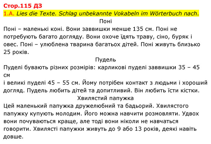 1.A. Lies die Texte. Schlag unbekannte Vokabeln im Wörterbuch nach. Поні Поні – маленькі коні. Вони заввишки менше 135 см. Поні не потребують багато догляду. Вони охоче їдять траву, сіно, буряк і овес. Поні – улюблена тварина багатьох дітей. Поні живуть близько 25 років. Пудель Пуделі бувають різних розмірів: карликові пуделі заввишки 35 – 45 см і великі пуделі 45 – 55 см. Йому потрібен контакт з людьми і хороший догляд. Пудель любить дітей та допитливий. Він любить їсти кістки. Хвилястий папужка Цей маленький папужка дружелюбний та бадьорий. Хвилястого папужку купують молодим. Його можна навчити розмовляти. Удвох вони почуваються краще, але тоді вони ніколи не навчаться говорити. Хвилясті папужки живуть до 9 або 13 років, деякі навіть довше.