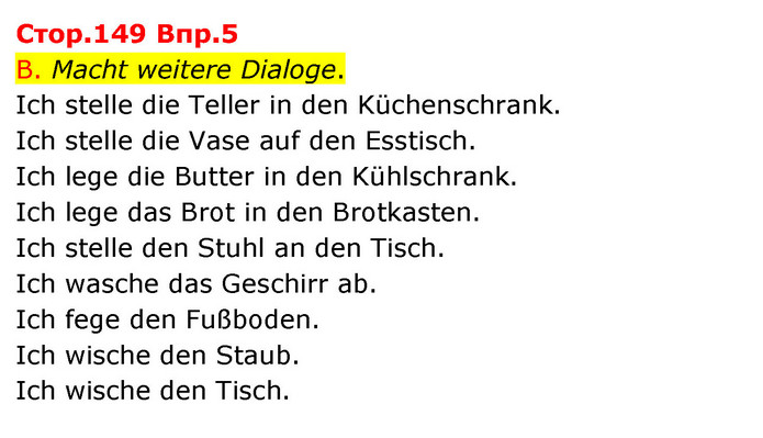 B. Macht weitere Dialoge. Ich stelle die Teller in den Küchenschrank. Ich stelle die Vase auf den Esstisch. Ich lege die Butter in den Kühlschrank. Ich lege das Brot in den Brotkasten. Ich stelle den Stuhl an den Tisch. Ich wasche das Geschirr ab. Ich fege den Fußboden. Ich wische den Staub. Ich wische den Tisch.