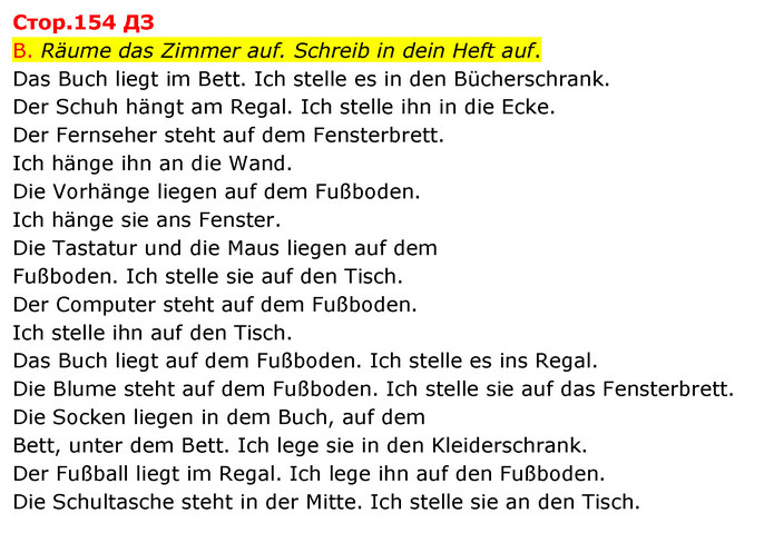 B. Räume das Zimmer auf. Schreib in dein Heft auf. Das Buch liegt im Bett. Ich stelle es in den Bücherschrank. Der Schuh hängt am Regal. Ich stelle ihn in die Ecke. Der Fernseher steht auf dem Fensterbrett. Ich hänge ihn an die Wand. Die Vorhänge liegen auf dem Fußboden. Ich hänge sie ans Fenster. Die Tastatur und die Maus liegen auf dem Fußboden. Ich stelle sie auf den Tisch. Der Computer steht auf dem Fußboden. Ich stelle ihn auf den Tisch. Das Buch liegt auf dem Fußboden. Ich stelle es ins Regal. Die Blume steht auf dem Fußboden. Ich stelle sie auf das Fensterbrett. Die Socken liegen in dem Buch, auf dem Bett, unter dem Bett. Ich lege sie in den Kleiderschrank. Der Fußball liegt im Regal. Ich lege ihn auf den Fußboden. Die Schultasche steht in der Mitte. Ich stelle sie an den Tisch.