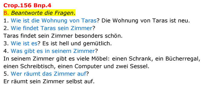B. Beantworte die Fragen. 1. Wie ist die Wohnung von Taras? Die Wohnung von Taras ist neu. 2. Wie findet Taras sein Zimmer? Taras findet sein Zimmer besonders schön. 3. Wie ist es? Es ist hell und gemütlich. 4. Was gibt es in seinem Zimmer? In seinem Zimmer gibt es viele Möbel: einen Schrank, ein Bücherregal, einen Schreibtisch, einen Computer und zwei Sessel. 5. Wer räumt das Zimmer auf? Er räumt sein Zimmer selbst auf.