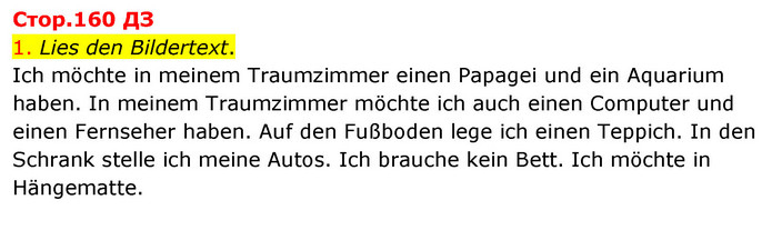 1. Lies den Bildertext. Ich möchte in meinem Traumzimmer einen Papagei und ein Aquarium haben. In meinem Traumzimmer möchte ich auch einen Computer und einen Fernseher haben. Auf den Fußboden lege ich einen Teppich. In den Schrank stelle ich meine Autos. Ich brauche kein Bett. Ich möchte in Hängematte.