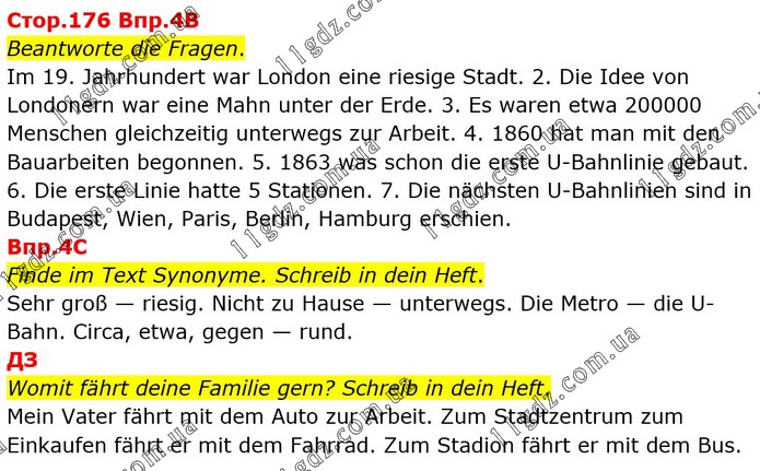 Beantworte die Fragen. Im 19. Jahrhundert war London eine riesige Stadt. 2. Die Idee von Londonern war eine Mahn unter der Erde. 3. Es waren etwa 200000 Menschen gleichzeitig unterwegs zur Arbeit. 4. 1860 hat man mit den Bauarbeiten begonnen. 5. 1863 was schon die erste U-Bahnlinie gebaut. 6. Die erste Linie hatte 5 Stationen. 7. Die nächsten U-Bahnlinien sind in Budapest, Wien, Paris, Berlin, Hamburg erschien. Впр.4C Finde im Text Synonyme. Schreib in dein Heft. Sehr groß — riesig. Nicht zu Hause — unterwegs. Die Metro — die U-Bahn. Circa, etwa, gegen — rund. ДЗ Womit fährt deine Familie gern? Schreib in dein Heft. Mein Vater fährt mit dem Auto zur Arbeit. Zum Stadtzentrum zum Einkaufen fährt er mit dem Fahrrad. Zum Stadion fährt er mit dem Bus.