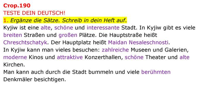 TESTE DEIN DEUTSCH! 1. Ergänze die Sätze. Schreib in dein Heft auf. Kyjiw ist eine alte, schöne und interessante Stadt. In Kyjiw gibt es viele breiten Straßen und großen Plätze. Die Hauptstraße heißt Chreschtschatyk. Der Hauptplatz heißt Maidan Nesaleschnosti. In Kyjiw kann man vieles besuchen: zahlreiche Museen und Galerien, moderne Kinos und attraktive Konzerthallen, schöne Theater und alte Kirchen. Man kann auch durch die Stadt bummeln und viele berühmten Denkmäler besichtigen.