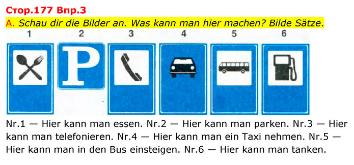 A. Schau dir die Bilder an. Was kann man hier machen? Bilde Sätze. Nr.1 — Hier kann man essen. Nr.2 — Hier kann man parken. Nr.3 — Hier kann man telefonieren. Nr.4 — Hier kann man ein Taxi nehmen. Nr.5 — Hier kann man in den Bus einsteigen. Nr.6 — Hier kann man tanken.