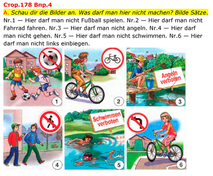 A. Schau dir die Bilder an. Was darf man hier nicht machen? Bilde Sätze. Nr.1 — Hier darf man nicht Fußball spielen. Nr.2 — Hier darf man nicht Fahrrad fahren. Nr.3 — Hier darf man nicht angeln. Nr.4 — Hier darf man nicht gehen. Nr.5 — Hier darf man nicht schwimmen. Nr.6 — Hier darf man nicht links einbiegen.