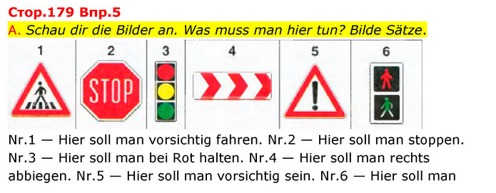 A. Schau dir die Bilder an. Was muss man hier tun? Bilde Sätze. Nr.1 — Hier soll man vorsichtig fahren. Nr.2 — Hier soll man stoppen. Nr.3 — Hier soll man bei Rot halten. Nr.4 — Hier soll man rechts abbiegen. Nr.5 — Hier soll man vorsichtig sein. Nr.6 — Hier soll man