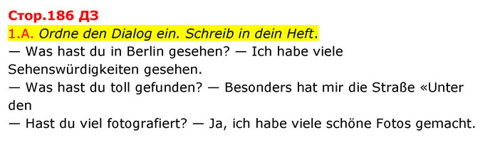1.A. Ordne den Dialog ein. Schreib in dein Heft. — Was hast du in Berlin gesehen? — Ich habe viele Sehenswürdigkeiten gesehen. — Was hast du toll gefunden? — Besonders hat mir die Straße «Unter den — Hast du viel fotografiert? — Ja, ich habe viele schöne Fotos gemacht.