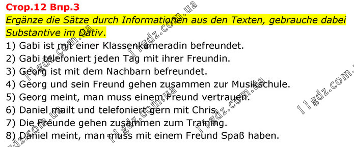 Cтop.12 Bпp.3 Ergänze die Sätze durch Informationen aus den Texten, gebrauche dabei Substantive im Dativ. 1) Gabi ist mit einer Klassenkameradin befreundet. 2) Gabi telefoniert jeden Tag mit ihrer Freundin. 3) Georg ist mit dem Nachbarn befreundet. 4) Georg und sein Freund gehen zusammen zur Musikschule. 5) Georg meint, man muss einem Freund vertrauen. 6) Daniel mailt und telefoniert gern mit Chris. 7) Die Freunde gehen zusammen zum Training. 8) Daniel meint, man muss mit einem Freund Spaß haben.