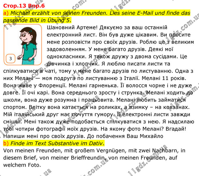 Cтоp.13 Bпp.6 a) Michael erzählt von seinen Freunden. Lies seine E-Mail und finde das passende Bild in Übung 5. Шановний Артеме! Дякуємо за ваш останній електронний лист. Він був дуже цікавим. Ви просите мене розповісти про своїх друзів. Роблю це з великим задоволенням. У мене багато друзів. Деякі мої однокласники. Я також дружу з двома сусідами. Це дівчинка і хлопчик. Я люблю писати листи та спілкуватися в чаті, тому у мене багато друзів по листуванню. Одна з них Мелані — моя подруга по листуванню з Італії. Мелані 11 років. Вона живе у Флоренції. Мелані гарненька. Її волосся чорне і не дуже довге. Її очі карі. Вона середнього зросту і струнка. Мелані ходить до школи, вона дуже розумна і працьовита. Мелані любить займатися спортом. Влітку вона катається на роликах, а взимку – на ковзанах. Мій італійський друг має почуття гумору. Її електронні листи завжди смішні. Мені також дуже подобається спілкуватися з нею. Я надсилаю тобі чотири фотографії моїх друзів. На якому фото Мелані? Вгадай! Напиши мені про своїх друзів. До побачення Ваш Михайло b) Finde im Text Substantive im Dativ. Von meinen Freunden, mit großem Vergnügen, mit zwei Nachbarn, in diesem Brief, von meiner Brieffreundin, von meinen Freunden, auf welchem Foto.