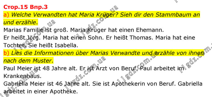 Cтоp.15 Bпp.3 a) Welche Verwandten hat Maria Krüger? Sieh dir den Stammbaum an und erzähle. Marias Familie ist groß. Maria Krüger hat einen Ehemann. Er heißt Jörg. Maria hat einen Sohn. Er heißt Thomas. Maria hat eine Tochter. Sie heißt Isabella. b) Lies die Informationen über Marias Verwandte und erzähle von ihnen nach dem Muster. Paul Meier ist 48 Jahre alt. Er ist Arzt von Beruf. Paul arbeitet im Krankenhaus. Gabriella Meier ist 46 Jahre alt. Sie ist Apothekerin von Beruf. Gabriella arbeitet in einer Apotheke.