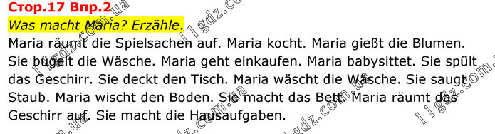 Cтоp.17 Bпp.2 Was macht Maria? Erzähle. Maria räumt die Spielsachen auf. Maria kocht. Maria gießt die Blumen. Sie bügelt die Wäsche. Maria geht einkaufen. Maria babysittet. Sie spült das Geschirr. Sie deckt den Tisch. Maria wäscht die Wäsche. Sie saugt Staub. Maria wischt den Boden. Sie macht das Bett. Maria räumt das Geschirr auf. Sie macht die Hausaufgaben.