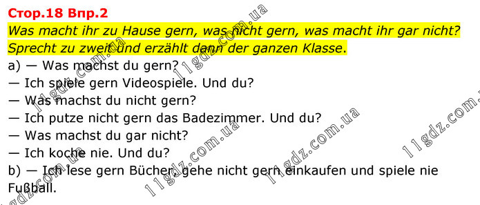 Стор.18 Впр.2 Was macht ihr zu Hause gern, was nicht gern, was macht ihr gar nicht? Sprecht zu zweit und erzählt dann der ganzen Klasse. a) — Was machst du gern? — Ich spiele gern Videospiele. Und du? — Was machst du nicht gern? — Ich putze nicht gern das Badezimmer. Und du? — Was machst du gar nicht? — Ich koche nie. Und du? b) — Ich lese gern Bücher, gehe nicht gern einkaufen und spiele nie Fußball.