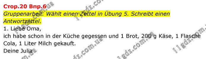 Cтоp.20 Bпp.6 Gruppenarbeit. Wählt einen Zettel in Übung 5. Schreibt einen Antwortzettel. 1. Liebe Oma, ich habe schon in der Küche gegessen und 1 Brot, 200 g Käse, 1 Flasche Cola, 1 Liter Milch gekauft. Deine Julia