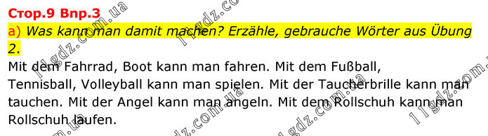 Cтop.9 Bnp.3 a) Was kann man damit machen? Erzähle, gebrauche Wörter aus Übung 2. Mit dem Fahrrad, Boot kann man fahren. Mit dem Fußball, Tennisball, Volleyball kann man spielen. Mit der Taucherbrille kann man tauchen. Mit der Angel kann man angeln. Mit dem Rollschuh kann man Rollschuh laufen.