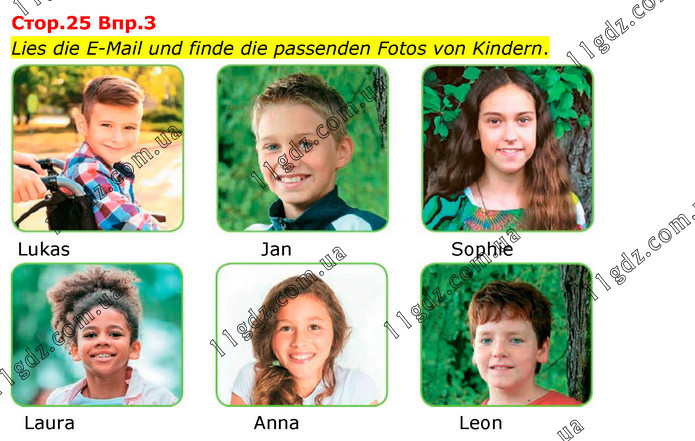 Cтоp.25 Bпp.3 Lies die E-Mail und finde die passenden Fotos von Kindern. Lukas Jan Sophie Laura Anna Leon