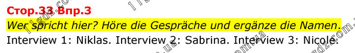 Cтоp.33 Bпp.3 Wer spricht hier? Höre die Gespräche und ergänze die Namen. Interview 1: Niklas. Interview 2: Sabrina. Interview 3: Nicole.