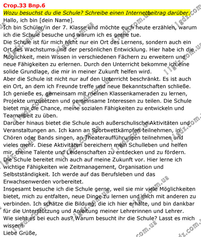 Стор.33 Впр.6 Wozu besuchst du die Schule? Schreibe einen Internetbeitrag darüber. Hallo, ich bin [dein Name]. Ich bin Schüler/in der 7. Klasse und möchte euch heute erzählen, warum ich die Schule besuche und warum ich es gerne tue. Die Schule ist für mich nicht nur ein Ort des Lernens, sondern auch ein Ort des Wachstums und der persönlichen Entwicklung. Hier habe ich die Möglichkeit, mein Wissen in verschiedenen Fächern zu erweitern und neue Fähigkeiten zu erlernen. Durch den Unterricht bekomme ich eine solide Grundlage, die mir in meiner Zukunft helfen wird. Aber die Schule ist nicht nur auf den Unterricht beschränkt. Es ist auch ein Ort, an dem ich Freunde treffe und neue Bekanntschaften schließe. Ich genieße es, gemeinsam mit meinen Klassenkameraden zu lernen, Projekte umzusetzen und gemeinsame Interessen zu teilen. Die Schule bietet mir die Chance, meine sozialen Fähigkeiten zu entwickeln und Teamarbeit zu üben. Darüber hinaus bietet die Schule auch außerschulische Aktivitäten und Veranstaltungen an. Ich kann an Sportwettkämpfen teilnehmen, in Chören oder Bands singen, an Theateraufführungen teilnehmen und vieles mehr. Diese Aktivitäten bereichern mein Schulleben und helfen mir, meine Talente und Leidenschaften zu entdecken und zu fördern. Die Schule bereitet mich auch auf meine Zukunft vor. Hier lerne ich wichtige Fähigkeiten wie Zeitmanagement, Organisation und Selbstständigkeit. Ich werde auf das Berufsleben und das Erwachsenwerden vorbereitet. Insgesamt besuche ich die Schule gerne, weil sie mir viele Möglichkeiten bietet, mich zu entfalten, neue Dinge zu lernen und mich mit anderen zu verbinden. Ich schätze die Bildung, die ich hier erhalte, und bin dankbar für die Unterstützung und Anleitung meiner Lehrerinnen und Lehrer. Wie sieht es bei euch aus? Warum besucht ihr die Schule? Lasst es mich wissen! Liebe Grüße,