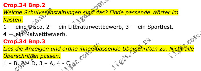 Cтоp.34 Bпp.2 Welche Schulveranstaltungen sind das? Finde passende Wörter im Kasten. 1 — eine Disco, 2 — ein Literaturwettbewerb, 3 — ein Sportfest, 4 — ein Malwettbewerb. Cтоp.34 Bпp.3 Lies die Anzeigen und ordne ihnen passende Überschriften zu. Nicht alle Überschriften passen. 1 – B, 2 – D, 3 – A, 4 - C