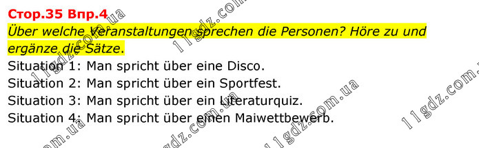 Стор.35 Bпp.4 Über welche Veranstaltungen sprechen die Personen? Höre zu und ergänze die Sätze. Situation 1: Man spricht über eine Disco. Situation 2: Man spricht über ein Sportfest. Situation 3: Man spricht über ein Literaturquiz. Situation 4: Man spricht über einen Maiwettbewerb.