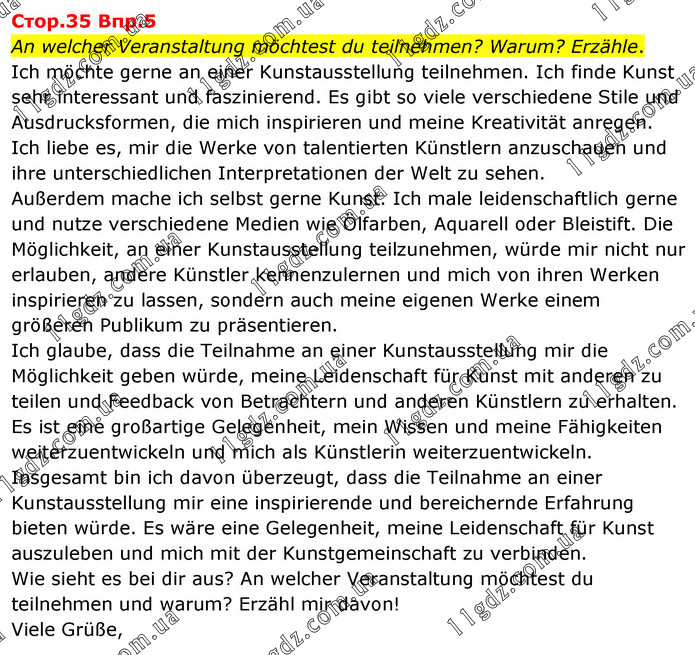 Стор.35 Впр.5 An welcher Veranstaltung möchtest du teilnehmen? Warum? Erzähle. Ich möchte gerne an einer Kunstausstellung teilnehmen. Ich finde Kunst sehr interessant und faszinierend. Es gibt so viele verschiedene Stile und Ausdrucksformen, die mich inspirieren und meine Kreativität anregen. Ich liebe es, mir die Werke von talentierten Künstlern anzuschauen und ihre unterschiedlichen Interpretationen der Welt zu sehen. Außerdem mache ich selbst gerne Kunst. Ich male leidenschaftlich gerne und nutze verschiedene Medien wie Ölfarben, Aquarell oder Bleistift. Die Möglichkeit, an einer Kunstausstellung teilzunehmen, würde mir nicht nur erlauben, andere Künstler kennenzulernen und mich von ihren Werken inspirieren zu lassen, sondern auch meine eigenen Werke einem größeren Publikum zu präsentieren. Ich glaube, dass die Teilnahme an einer Kunstausstellung mir die Möglichkeit geben würde, meine Leidenschaft für Kunst mit anderen zu teilen und Feedback von Betrachtern und anderen Künstlern zu erhalten. Es ist eine großartige Gelegenheit, mein Wissen und meine Fähigkeiten weiterzuentwickeln und mich als Künstlerin weiterzuentwickeln. Insgesamt bin ich davon überzeugt, dass die Teilnahme an einer Kunstausstellung mir eine inspirierende und bereichernde Erfahrung bieten würde. Es wäre eine Gelegenheit, meine Leidenschaft für Kunst auszuleben und mich mit der Kunstgemeinschaft zu verbinden. Wie sieht es bei dir aus? An welcher Veranstaltung möchtest du teilnehmen und warum? Erzähl mir davon! Viele Grüße,