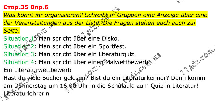 Cтоp.35 Bпp.6 Was könnt ihr organisieren? Schreibt in Gruppen eine Anzeige über eine der Veranstaltungen aus der Liste. Die Fragen stehen euch auch zur Seite. Situation 1: Man spricht über eine Disko. Situation 2: Man spricht über ein Sportfest. Situation 3: Man spricht über ein Literaturquiz. Situation 4: Man spricht über einen Malwettbewerb. Ein Literaturwettbewerb Hast du viele Bücher gelesen? Bist du ein Literaturkenner? Dann komm am Donnerstag um 16.00 Uhr in die Schulaula zum Quiz in Literatur! Literaturlehrerin